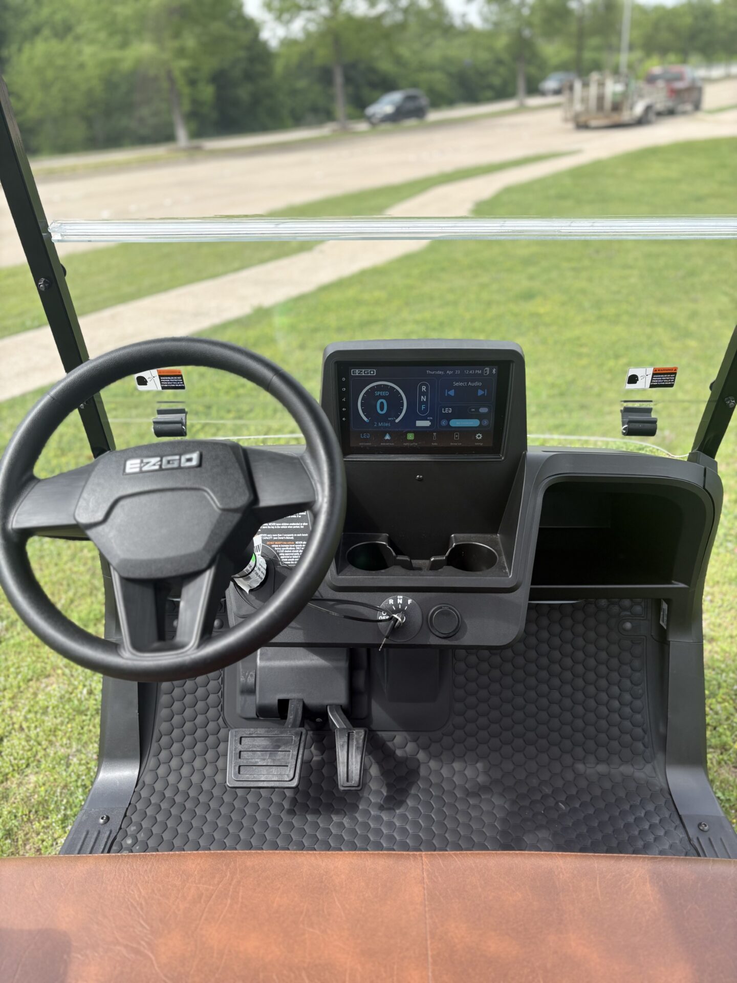 Backed by E-Z-GO & ECOXGEAR, the touchscreen delivers essential features for every golf cart ride. Control Bluetooth® music, AM/FM radio, & LED speaker lights with the tap of a finger, & view speed, charge level, & other key insights at any time.